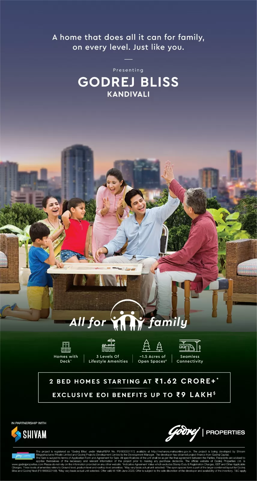 Ans: The 2 BHK in Godrej Bliss Kandivali East is priced at 1.71 Cr Onwards* for 606 to 739 sq.ft..