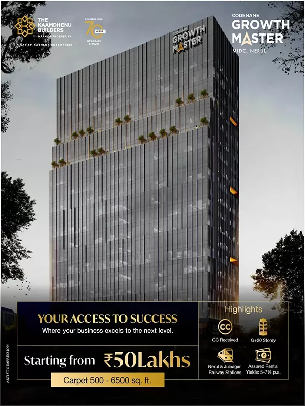 Ans: The Office Spaces in Kamdhenu Growth Master Nerul is priced at ₹62 Lakhs + Taxes Onwards for 505-1,205 sq.ft..