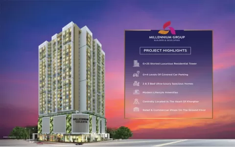 Ans: Millennium Celesta Kharghar offers premium amenities including clubhouse, swimming pool, gymnasium, landscaped gardens, children's play area, and 24/7 security.