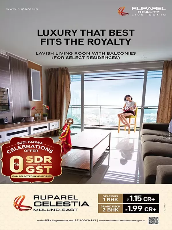 Ans: Ruparel Celestia Mulund East offers 1, 1+1 Jodi, 2, Commercial Offices, Commercial Shop BHK configurations. Detailed floor plans are available in the Site & Floor Plan section above.